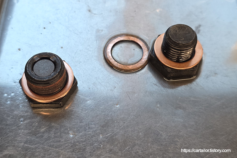 전용 씰란트가 발린 신품 드레인플러그와 신품 와셔를 사용합니다. 주입구플러그는 세척 후, 신품 와셔를 걸어줍니다.