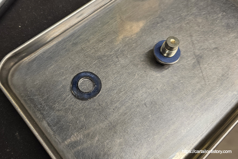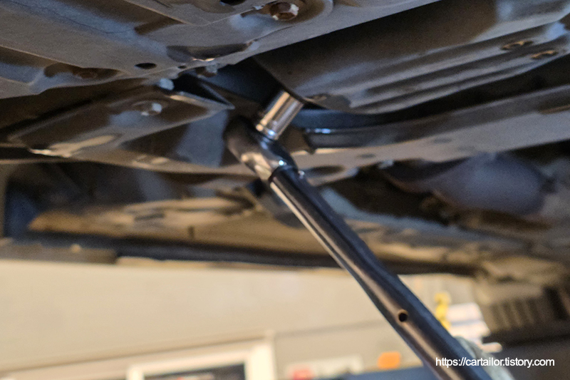 드레인플러그 와셔를 신품으로 교체 후, 오일 배출이 완전히 끝났으면 드레인볼트를 손으로 끝까지 돌려준 뒤, 토크렌치를 사용하여 규정값으로 정확하게 체결합니다.