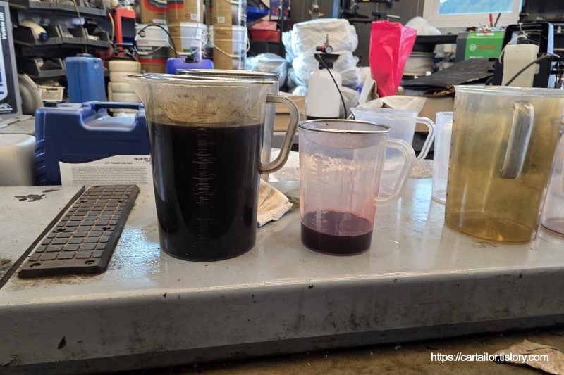 좌측부터 기존 사용유, 레벨링 시 배출된 오일 그리고 교체 후 폐기되는 소모품들입니다. 레벨링 시 배출된 오일이 현재 차량의 미션오일 상태로 보시면 되겠습니다.