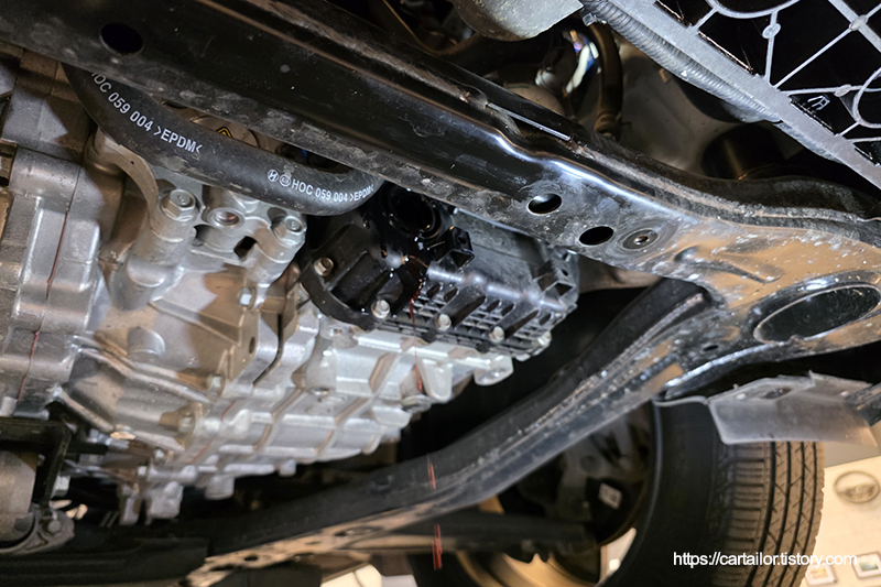유지 보수 목적으로 미션오일교환 작업을 위해 입고된 쏘렌토(MQ4) 1.6T-HEV 모델입니다. 1.6리터 감마 터보엔진과 6단 자동변속기가 조합하여 높은 효율을 달성하고 있습니다. 자동변속기의 경우 특이하게 초기 발진과 크리핑시 동력을 모터만 사용하게 되어 토크컨버터가 없습니다.