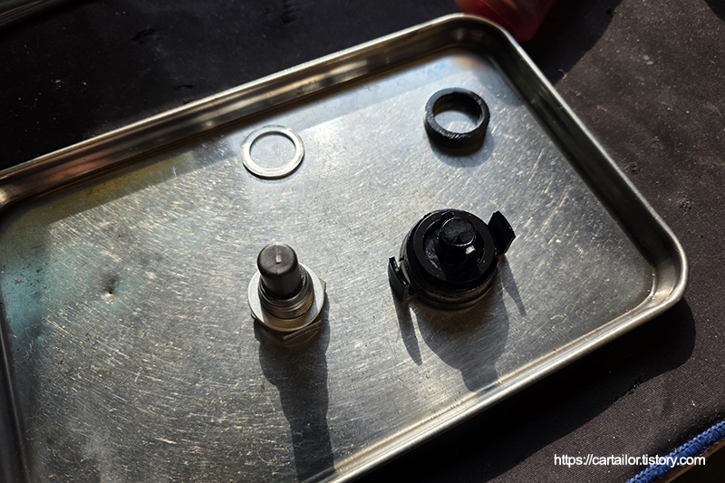 세척 및 건조가 끝난 드레인플러그에 신품 와셔를 걸어줍니다. 레벨링플러그 오링도 신품으로 준비합니다.
