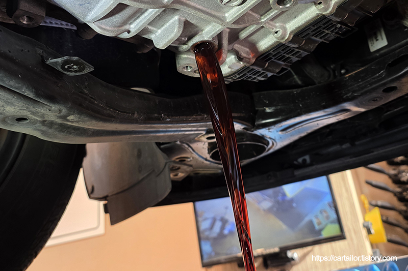 지침서에 명시된 용량의 신유 주입까지 마무리하면 변속기오일교환 과정이 종료됩니다.