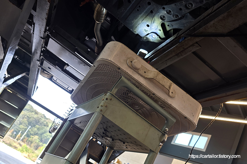 입고 직후 확인한 미션오일 온도로, 오일을 배출하기엔 유온이 높아 팬을 이용해 식히는 시간을 갖습니다.