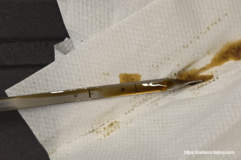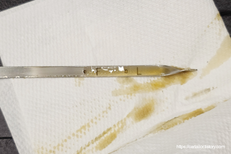 시동을 끄고 수분 뒤, 오일 상태를 체크합니다. 상태는 양호하며, 오일량도 기준치 내 위치해있습니다.