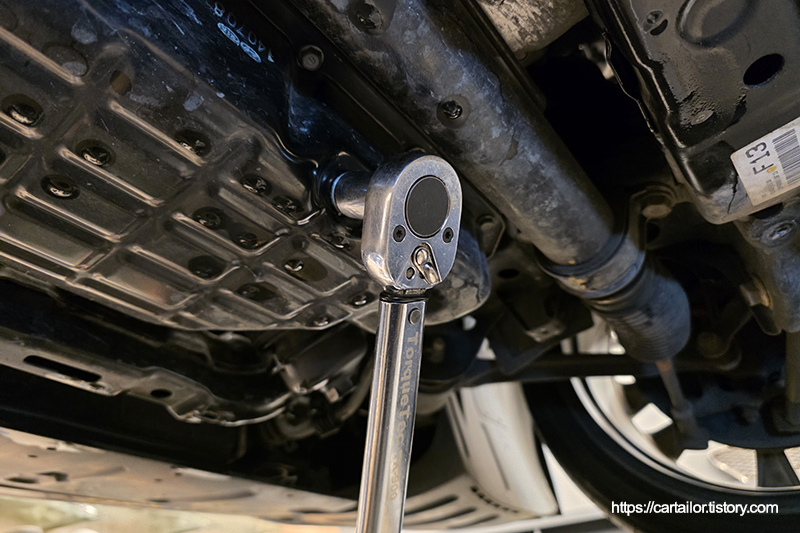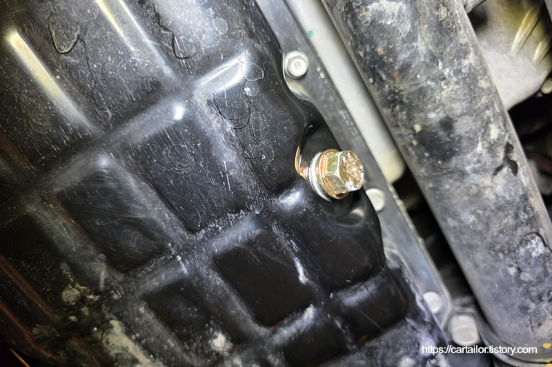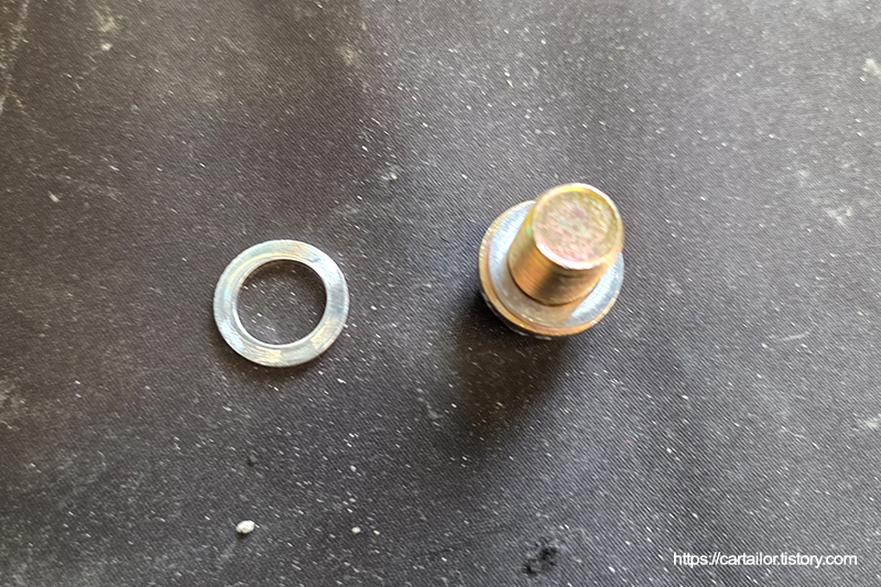 드레인플러그 와셔를 교환합니다. 오일 배출이 완전히 끝났으면 플러그를 손으로 끝까지 돌려준 뒤, 토크렌치를 이용해 규정 토크로 체결해 마무리합니다.