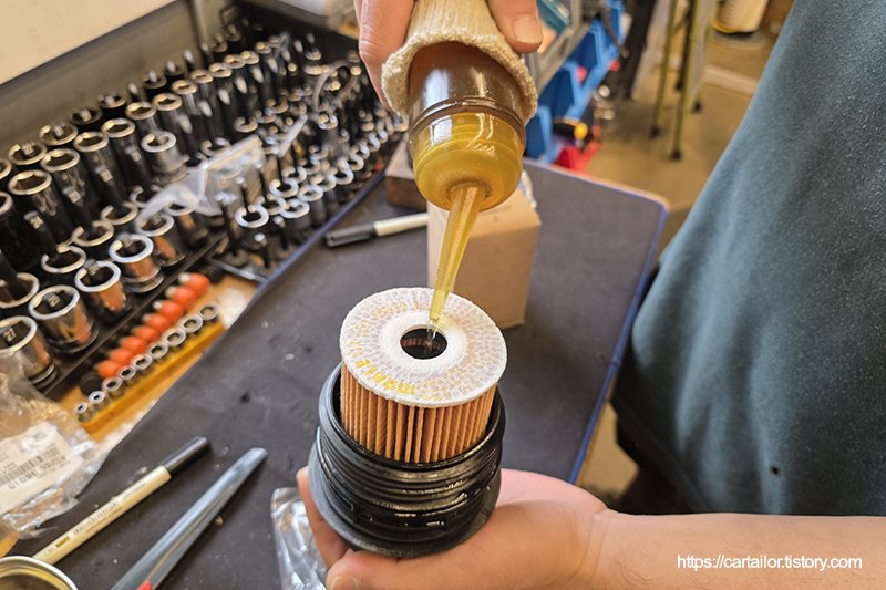 세척 및 건조가 끝난 필터캡에 신유를 바른 신품 오링, 필터를 결합합니다. 토크렌치를 이용해 규정 토크로 체결합니다.