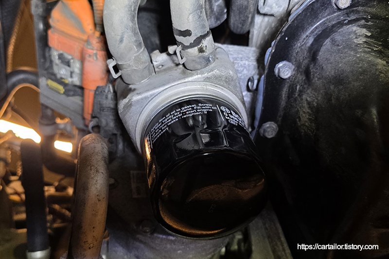 신품 오일 필터 씰링에 신유를 발라 윤활시킨 후, 토크렌치를 이용해 규정 토크로 체결합니다.