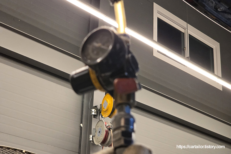잔유 제거를 위해 전용 어답터와 호스를 연결 후 차량을 리프팅합니다.