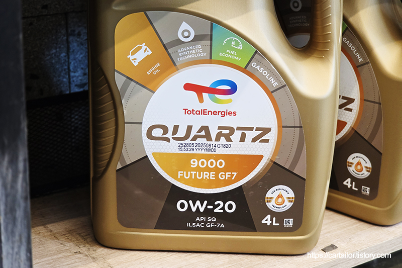 주입할 엔진오일은 토탈쿼츠 9000 퓨쳐 0W-20 입니다. 해당 차량이 요구하는 엔진오일 규격 및 점도 모두 정확하게 일치하는 합성 엔진오일이며, 특히 0W 점도의 경우 낮은 냉간유동점을 갖기 때문에 빠른 유온상승으로 냉간 상태의 운행이 최소화되는 이점이 있습니다.