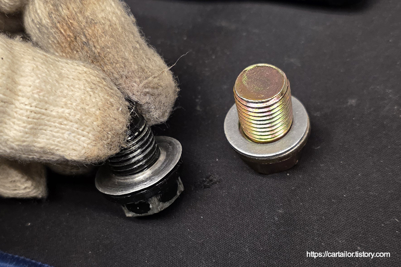 공장 출하 이후, 단 한 번도 교체이력이 없는 드레인플러그와셔네요. 공장에서 오일팬을 도색할 때 드레인볼트를 결합한 상태에서 진행하는데 이 때 와셔 측면도 함께 도색되기 때문에 와셔가 공장 출고품임을 알 수 있습니다. 와셔와 함께 한 몸이 되어 분리가 되지 않는 드레인플러그도 함께 신품으로 교체합니다.