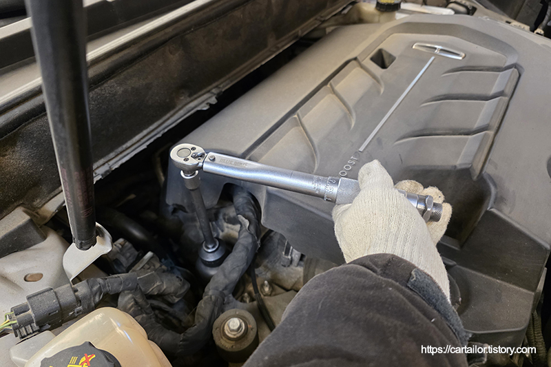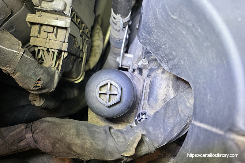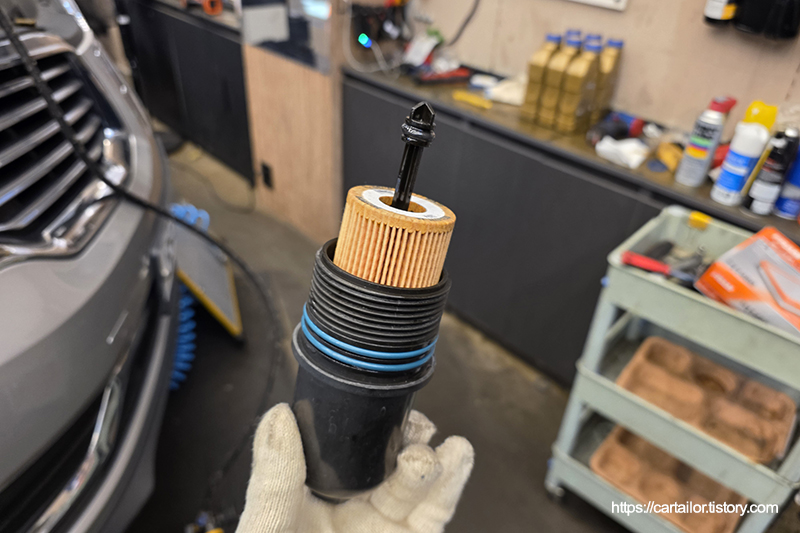 세척 및 건조가 끝난 필터캡에 신품 오링과 필터를 장착합니다 모든 접촉면에는 신유를 발라 윤활한 다음, 토크렌치를 이용해 규정 토크로 체결합니다.