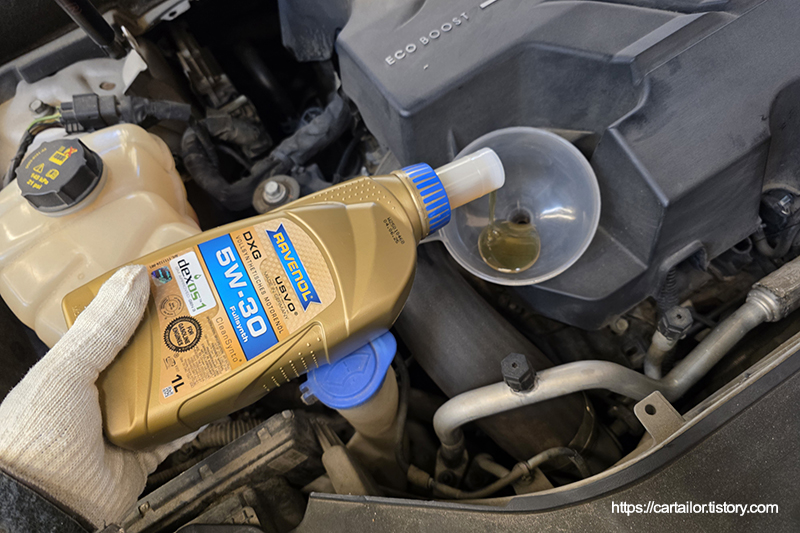 주입할 신유는 라베놀 DXG 5W-30제품으로, 해당 차량이 요구하는 SAE 5W30에 FORD WWS-M2C946-A 규격이며, 에스터와 PAO를 베이스로 하는 4기유 및 5기유로 구성된 베이스유 기반에 DEXOS1 GEN3 첨가제 패키징이 첨가된 100% 합성유 입니다.