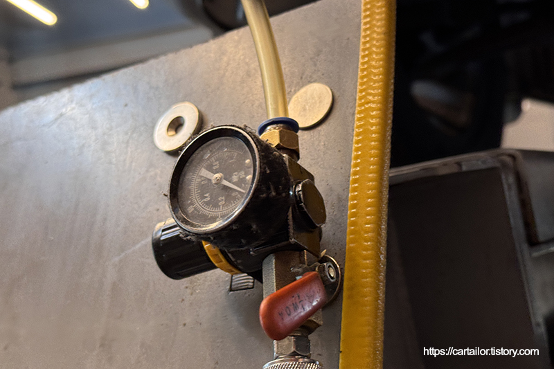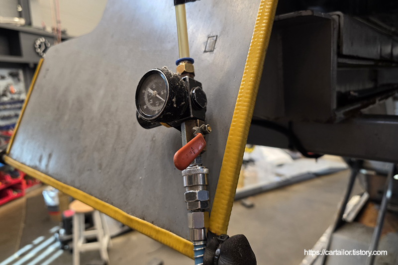 잔유 제거를 위해 에어 호스를 연결 후 차량을 리프팅합니다.