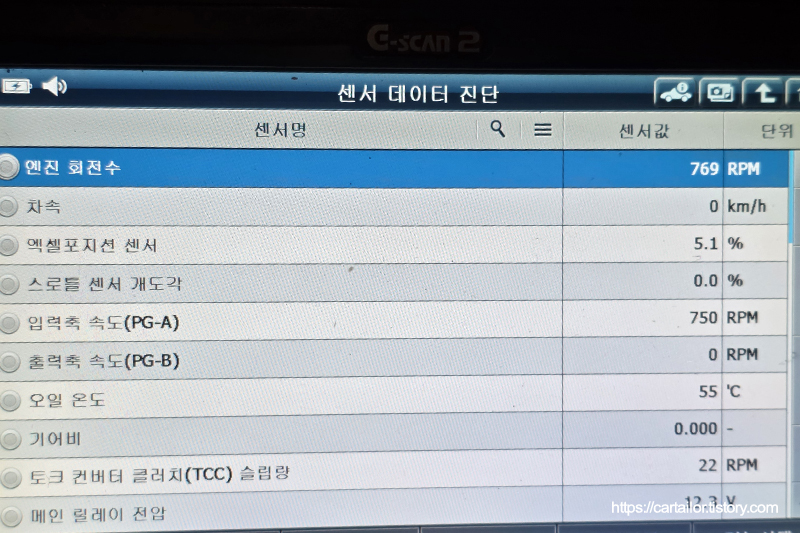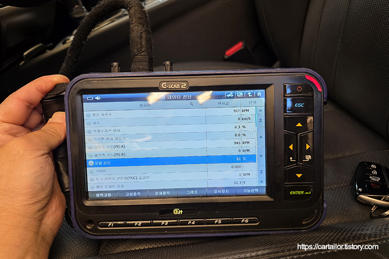 입고 직후 확인한 미션오일 온도로, 오일을 배출하기엔 유온이 다소 높아 식히는 동안 다른 작업 먼저 시작합니다.