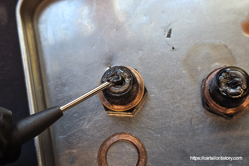 전용 씰란트가 발린 신품 드레인플러그와 신품 와셔를 사용합니다. 주입구플러그는 세척 후, 신품 와셔를 걸어줍니다.