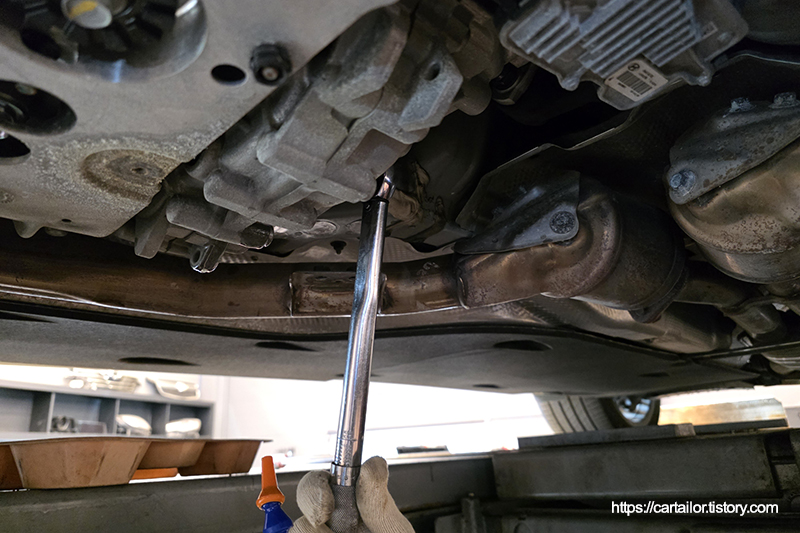 오일 배출이 완전히 끝났으면 드레인플러그를 손으로 돌려준 뒤, 토크렌치를 이용해 규정 토크로 체결합니다.