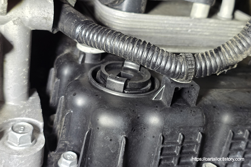 언더커버를 탈거 후, 드레인플러그를 풀어 기존 사용유를 배출합니다.