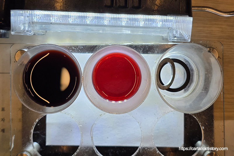 좌측부터 기존 사용유, 레벨링 시 배출된 오일 그리고 교체된 소모품들입니다. 레벨링 시 나온 미션오일이 현재 차량의 변속기 오일 상태로 보시면 되겠습니다.