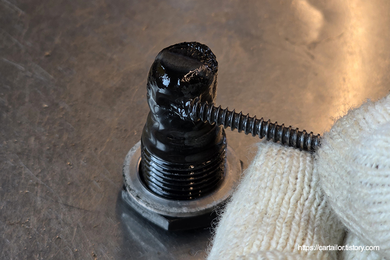 배출이 완전히 끝났으면 플러그를 손으로 끝까지 돌려준 뒤, 토크렌치를 이용해 규정 토크로 체결합니다.