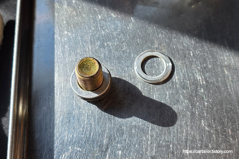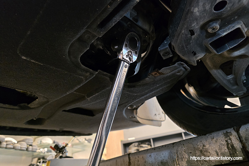 드레인플러그 와셔를 교체 후, 드레인이 완전히 끝났으면 토크렌치를 이용해 규정 토크로 드레인플러그를 체결합니다.