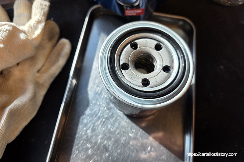신품 오일필터 오링에 신유를 바른 뒤, 토크렌치를 이용해 규정 토크로 조여줍니다.