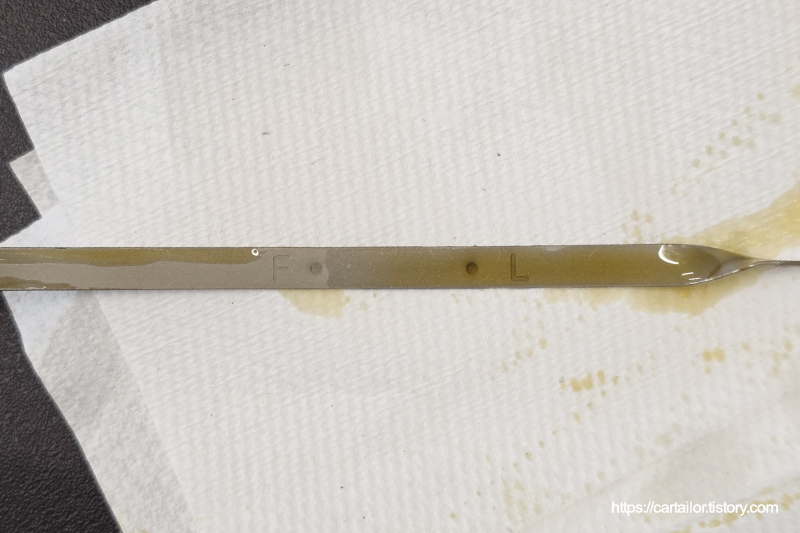 시동을 끄고 수분 후, 딥스틱을 뽑아 상태를 체크합니다. 오일 상태, 오일량 모두 양호합니다.