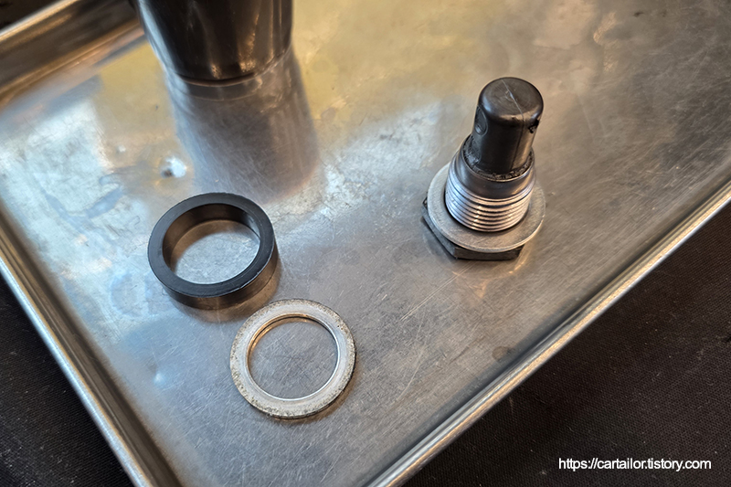 세척 및 건조를 마친 플러그에 신품 와셔를 걸어준 뒤, 레벨링플러그 씰링도 신품으로 준비합니다.