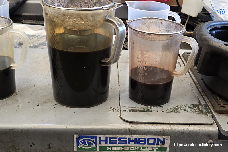 좌측부터 기존 사용유, 레벨링 시 배출된 오일 그리고 교체 후 폐기되는 소모품들입니다. 레벨링 시 배출된 오일이 현재 차량의 미션오일 상태로 보시면 되겠습니다.