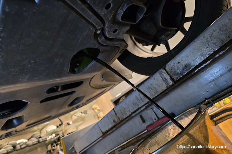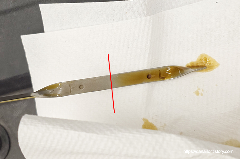 시동을 끄고 수분 후 딥스틱을 뽑아 오일량을 확인합니다. 정량 잘 주입되었습니다.