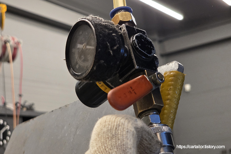 배출구 형상에 맞게 차를 기울인 뒤, 입으로 부는 정도의 약한 세기로 에어를 세팅해 잔유를 배출합니다.