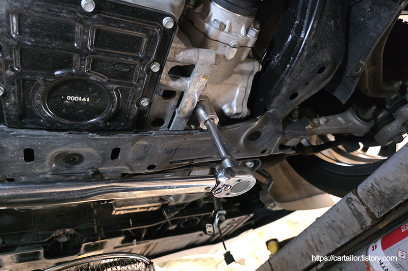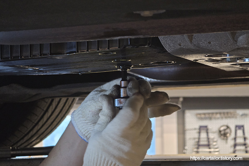 오일 배출이 완전히 끝났으면 드레인플러그를 손으로 돌려준 뒤, 토크렌치를 이용해 규정 토크로 체결합니다.