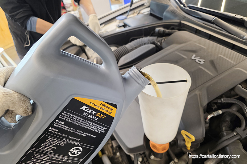 주입할 엔진오일은 킥스 GX7 5W-30으로, 기존 저희 매장의 엔트리 합성유로 사용하던 킥스 G1이 단종 됨에 따라 후속제품인 GX7이 그 자리를 대신하게 되었습니다.