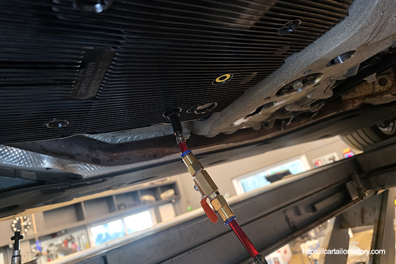 전용 어답터를 장착 후, 레벨링 작업을 감안한 용량의 신유를 주입합니다. 시동을 걸어 변속을 진행 후, N단에 위치해 레벨링 작업을 시작합니다.