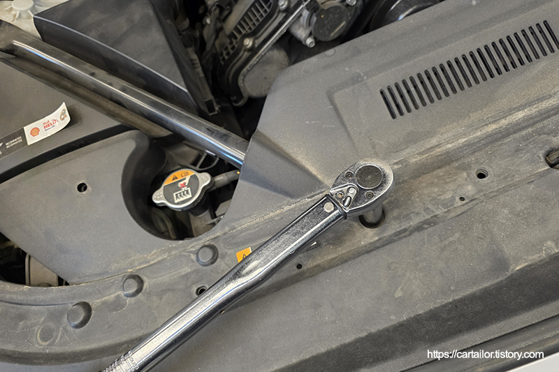 에어클리너를 신품으로 교환 후, 탈거했던 스트럿바 고정 볼트를 규정 토크로 체결합니다.