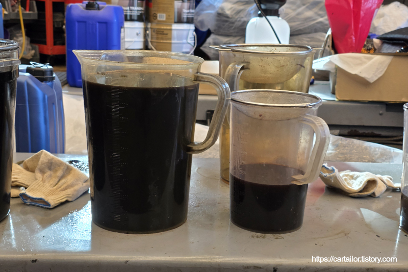 좌측부터 기존 미션오일, 레벨링 시 배출된 오일입니다. 우측이 현재 차량의 변속기 오일 상태로 보시면 되겠습니다.