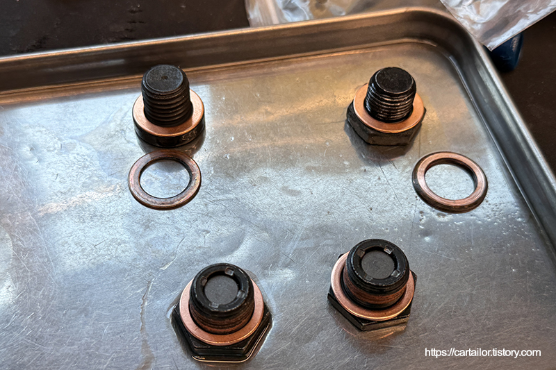 전용 씰란트가 발린 신품 드레인플러그 그리고 신품 와셔를 사용하며, 세척 및 건조를 마친 주입구플러그에 신품 와셔를 걸어줍니다.