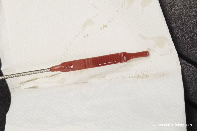 시동을 끄고 수분 뒤, 오일 상태를 체크합니다. 상태는 양호하며, 오일량도 기준치 내 위치해있습니다.