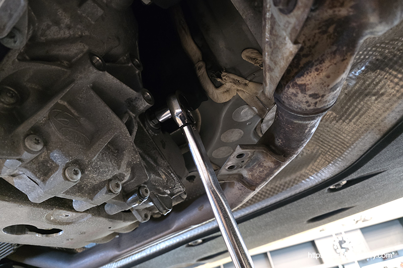레벨링플러그를 개방해 과주입된 미션오일을 배출합니다. 미션오일이 미량 혹은 방울 단위로 떨어질 때 재빨리 신품 레벨링플러그를 손으로 돌려 가체결합니다.