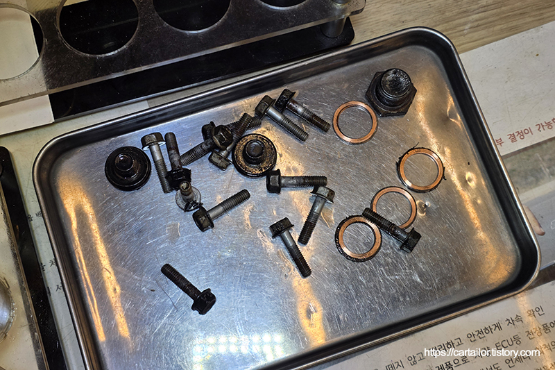 전용 세정제를 이용해 드레인과 주입구플러그들을 세척 후, 동일한 품번의 와셔들로 교체합니다.