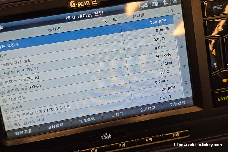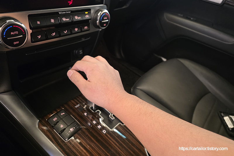 레벨링 작업을 감안한 용량의 신유를 주입 후, 시동을 걸어 변속을 진행합니다. 변속기 오일 온도가 일정 구간에 들어섰을 때, P단에 위치 후 레벨링 작업을 시작합니다.