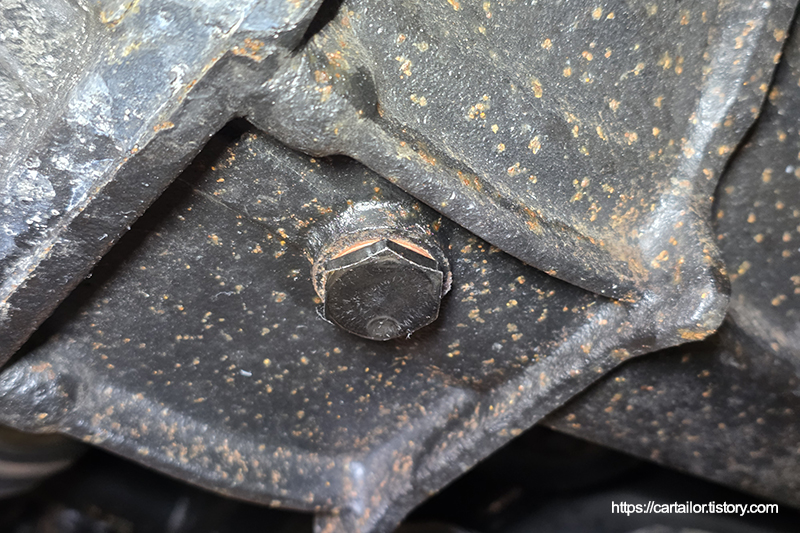 드레인플러그를 개방해 기존 사용유를 배출 후, 오일팬을 제거합니다.