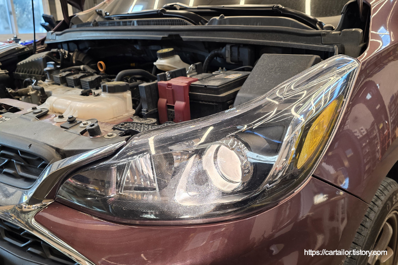 엔진오일교환 작업을 위해 입고된 더뉴스파크 차량입니다.