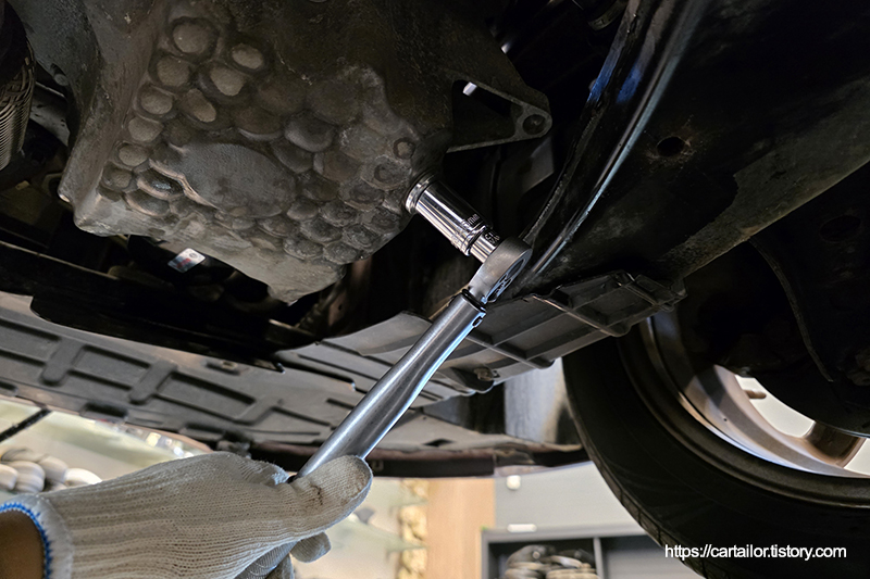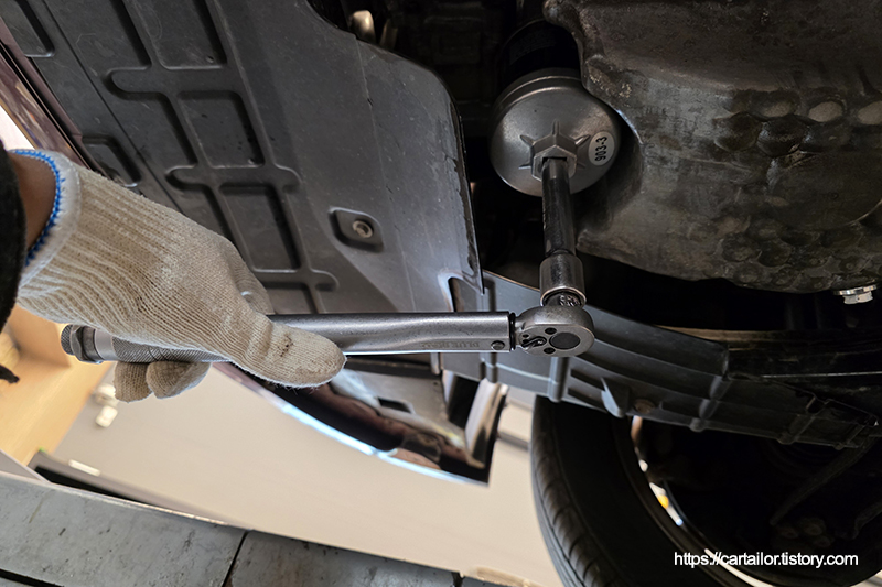 오일 배출이 끝났으면 가스켓을 교체한 플러그를 손으로 돌려준 뒤, 규정 토크로 조여줍니다.
