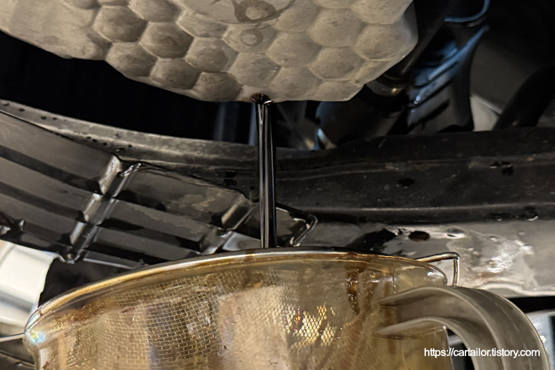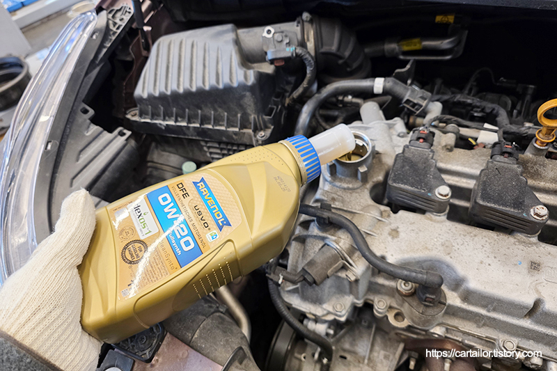 배출된 오일과 지침서에 명시된 용량을 토대로 신유를 주입 후 시동을 걸어 온도를 올리는 시간을 갖습니다.