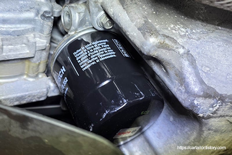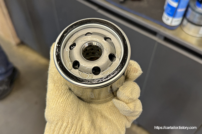 신품 오일 필터 씰링에 신유를 발라 윤활시킨 후, 토크렌치를 이용해 규정 토크로 체결합니다.