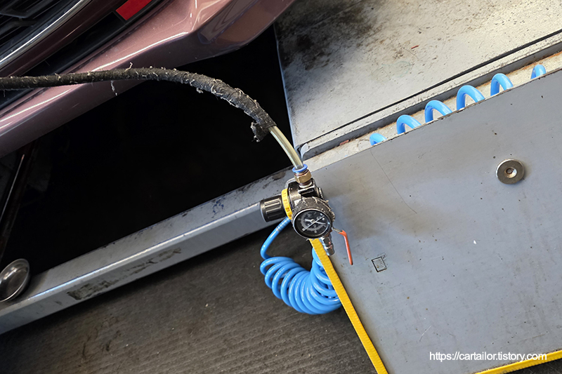 배출구 형상에 맞게 차량을 기울인 후, 마일드한 세기로 에어를 세팅해 잔유를 배출합니다.