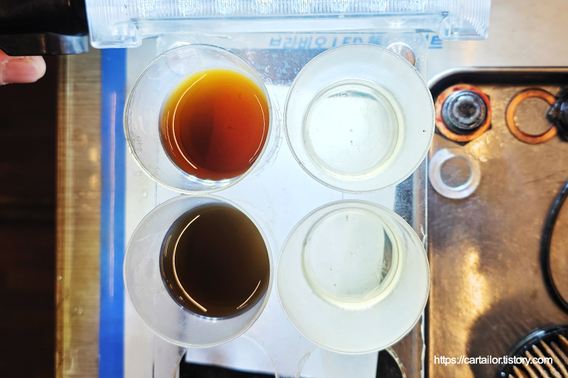 좌측은 기존 전륜과 후륜 디퍼런셜오일, 우측은 신유를 샘플링한 모습입니다.