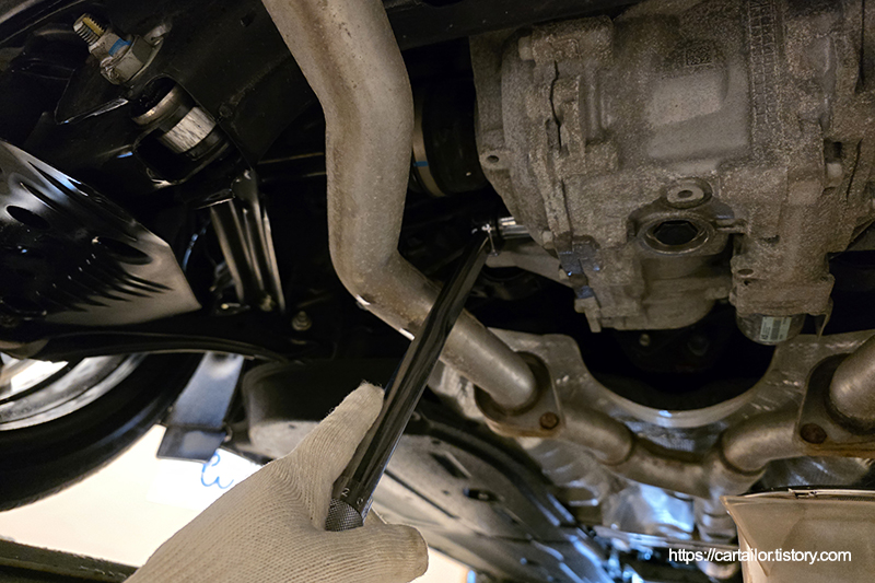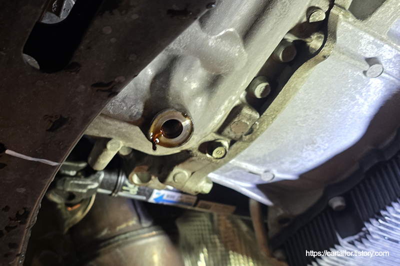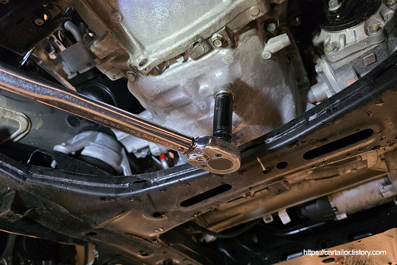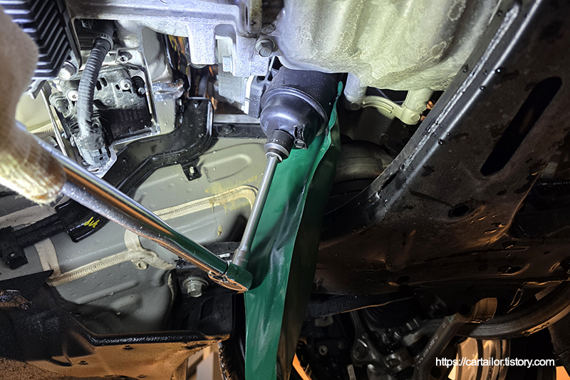 오일 배출이 완전히 끝났으면 드레인플러그를 손으로 돌려준 뒤, 토크렌치를 이용해 규정 토크로 체결합니다.
