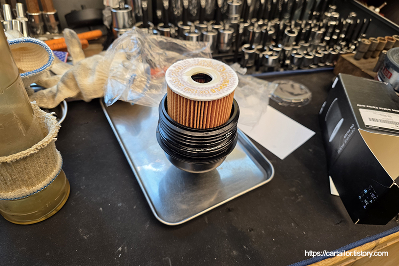 세척 및 건조를 마친 필터캡에 신유를 발라 윤활해둔 신품 오링과 카트리지 필터를 결합 후, 신품 세이프티핀을 장착해 마무리합니다. 필터캡을 손으로 돌려준 뒤, 토크렌치를 이용해 규정 토크로 체결합니다.