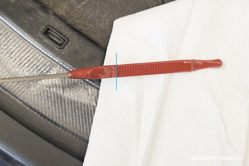 시동을 끄고 수분 후, 오일 상태를 체크합니다. 상태, 오일량 모두 양호합니다.
